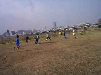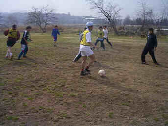 |  | | タオル巻(中村氏)がボールをキープ) | 多少イレギュラーするグラウンド(原っぱ)だけど、少しづつみんなで石ころ拾って、きれいにしましょう! |